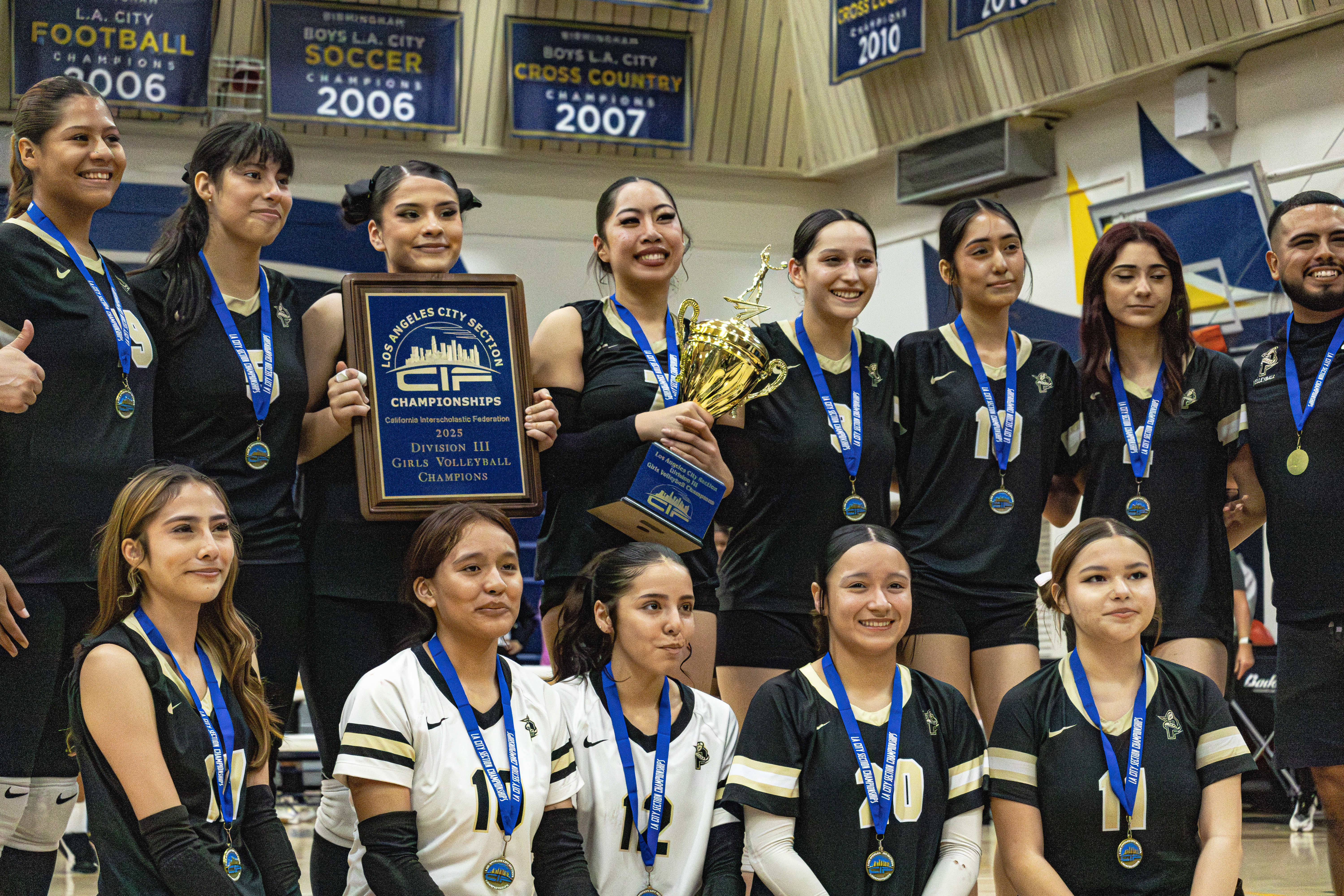 VAN NUYS, Ca – It was a typically warm November day in LA. The temperature read 80 degrees at Birmingham High School in Van Nuys. The venue was to host three Los Angeles City Section girls volleyball championships – D3, D2, D1 in sequence. It was a convergence of schools from all over the city – from North and East San Fernando Valley to East and West LA. The first of the three matches was an all-valley meeting between the Panorama Pythons and the Poly Parrots, and a tense battle saw the Pythons emerge with their first-ever City championship in volleyball. Both teams battled through four sets with Panorama coming out on top, 3-1 (25-23, 19-25, 24-14, 29-27).
